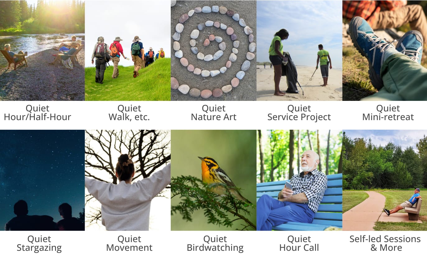 Some of the experiences the Quiet Hour Kit trains facilitators to offer: Quiet Hour and Half-Hour, Walk, etc., Nature Art, Service Project, Mini-retreat, Stargazing, Movement, Birdwatching, Call, Self-led Sessions, and more.